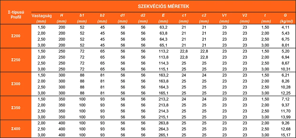 - Profilmagasság 200 és 400 mm között, lemezvastagság 1,50 és 3,00 mm között.