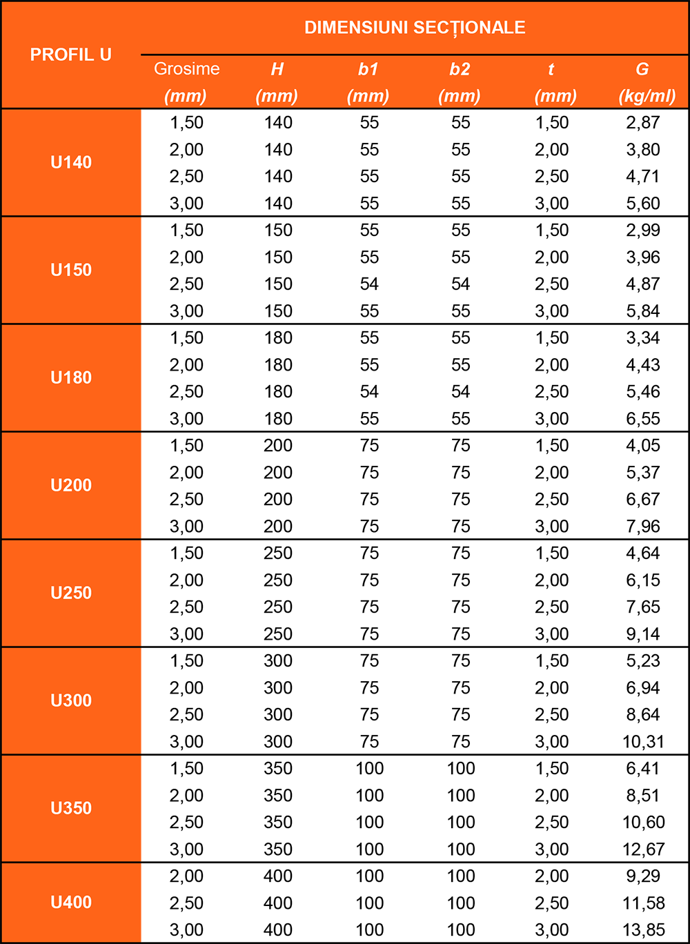 DIMENSIUNI SECȚIONALE PROFIL TIP U