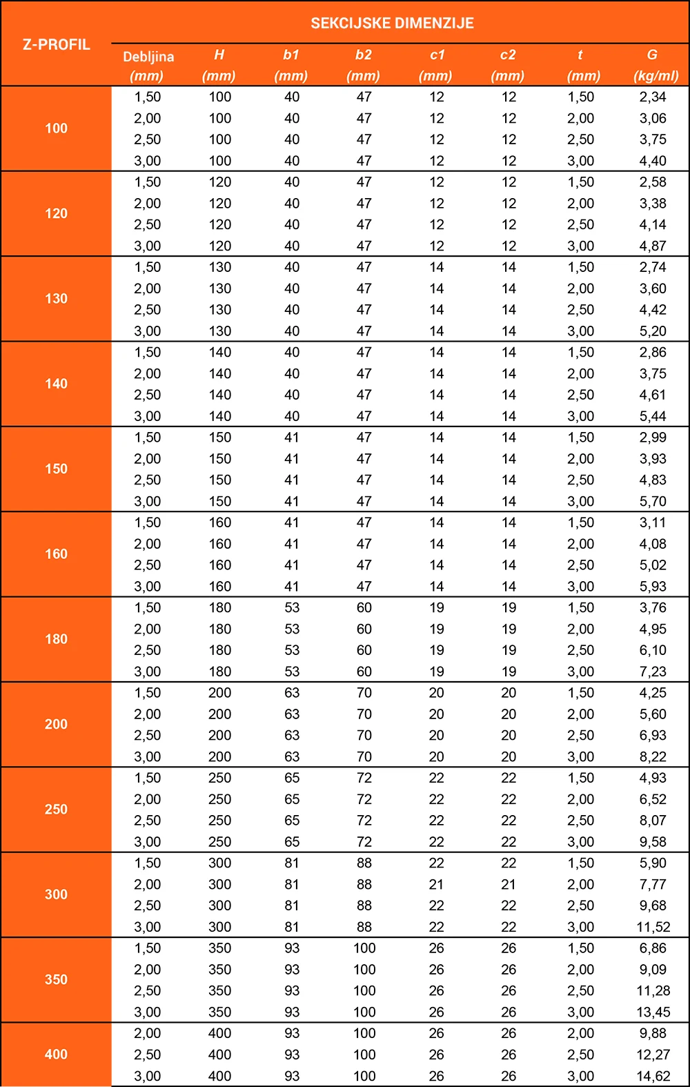 - Širok spektar dimenzija za profile Z, C, U i Σ, sa visinom profila između 100 i 400 mm i debljinama lima između 1,50 i 3,00 mm